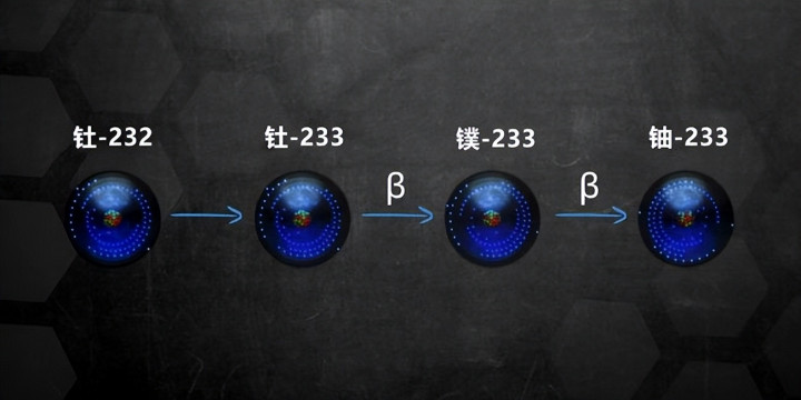 钍元素自身是不能直接用来发电的。“钍基熔盐核反应堆”使用钍元素进行发电,需要不断用中子源去轰击钍元素(钍-232),让钍-232裂变成铀-233,然后铀-233发生裂变反应,产生大量热量。