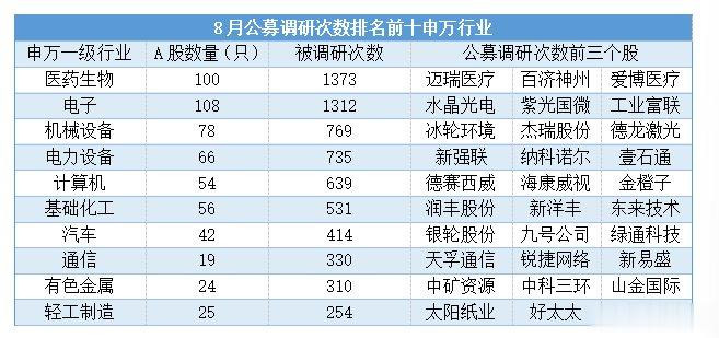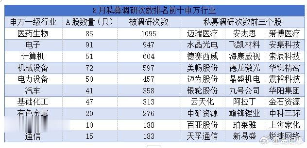 8月,公募机构对医药生物行业调研1373次,覆盖100只个股;私募机构调研1095次,覆盖85只个股。电子行业方面,公募机构调研1312次,覆盖108只个股;私募机构调研947次,覆盖91只个股。